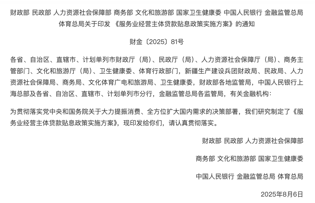 为贯彻落实党中央和国务院关于大力提振消费、全方位扩大国内需求的决策部署,根据中央办公厅、国务院办公厅印发的《提振消费专项行动方案》关于2025年对符合条件的消费领域服务业经营主体贷款给予财政贴息的要求,充分发挥财政政策引导带动作用,推动降低服务业经营主体融资成本,助力激发消费市场活力,以高质量供给创造有效需求,制定本实施方案。