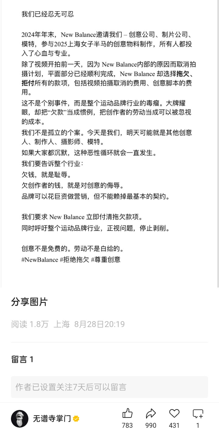 此事源于8月28日晚,设计美学博主“无谱寺掌门”在社交平台上发文称,2024年年末,NewBalance邀请他们包括创意公司、制片公司、模特,参与2025上海女子半马的创意物料制作,所有人都投入了心血。除了视频开拍前一天,因为NewBalance内部的原因而取消拍摄计划中金策略,平面部分已经顺利完成,NewBalance却选择拖欠、拒付所有的款项,包括视频拍摄取消的费用、创意脚本的费用。